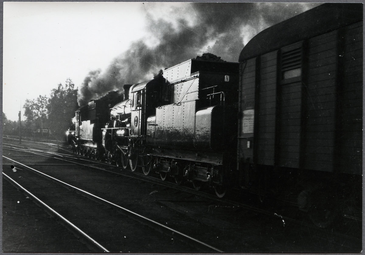 Dubbla SJ B-lok med persontåg startar sin färd norrut. Vagnen är en ilgodsvagn, typ Gi.