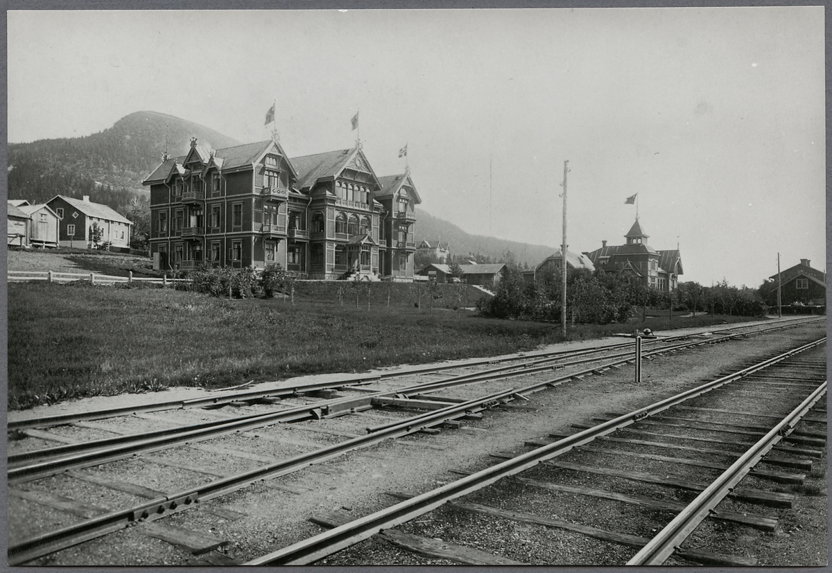 Åre station. Byggnaden till vänster är Grand Hotel sedermera kallat gamla Grand Hotel. Till höger syns Järnvägsrestaurangen.