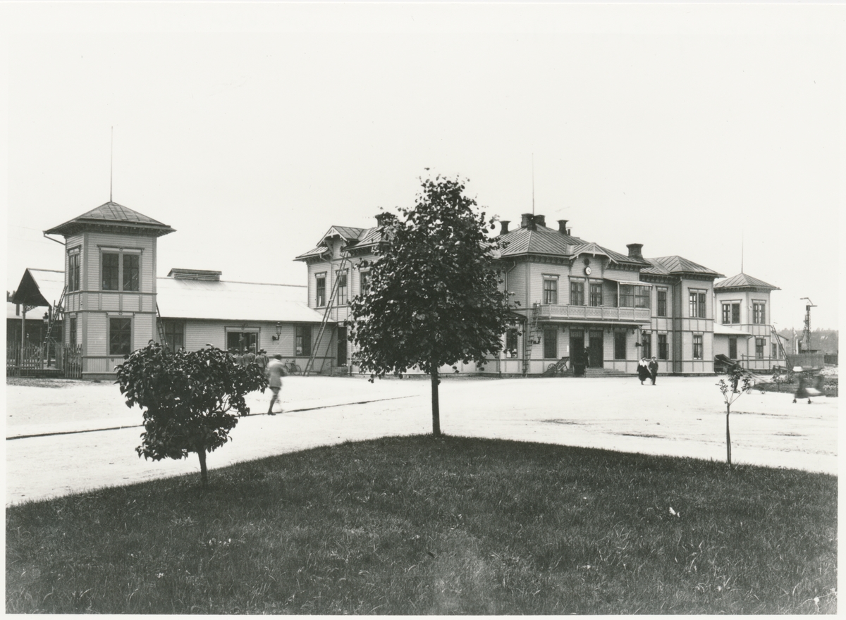 Vänersborgs station. Uddevalla-Vänersborg-Herrljunga Järnväg, UVHJ. Stationen byggd 1866, ritad av Arkitekt C Adelsköld. Stationen hade banhall mellan1866 - ca 1940. Elektrifiering 15/12 1949.