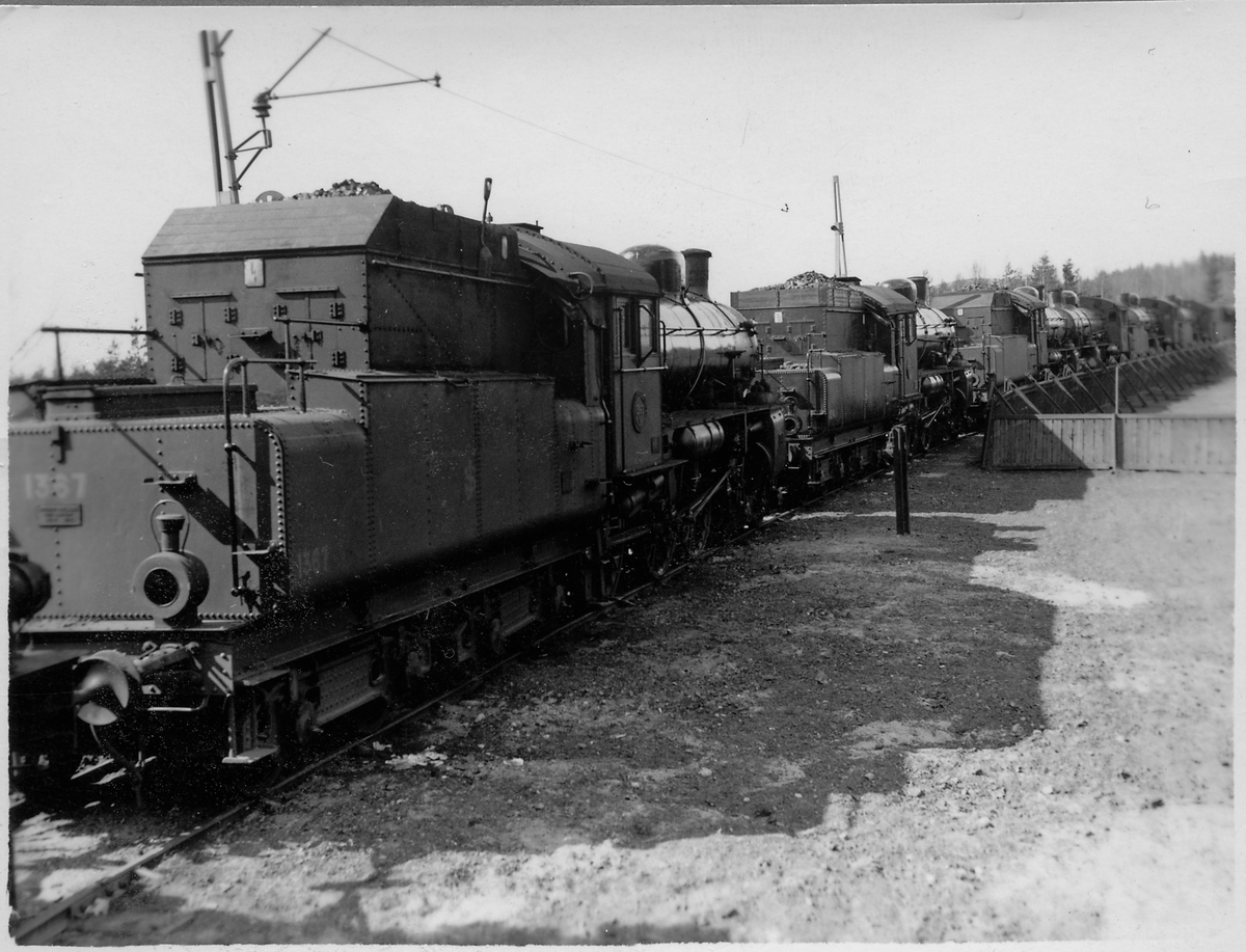 Statens Järnvägar SJ B 1367. Ånglok uppställda vid lokstallet.