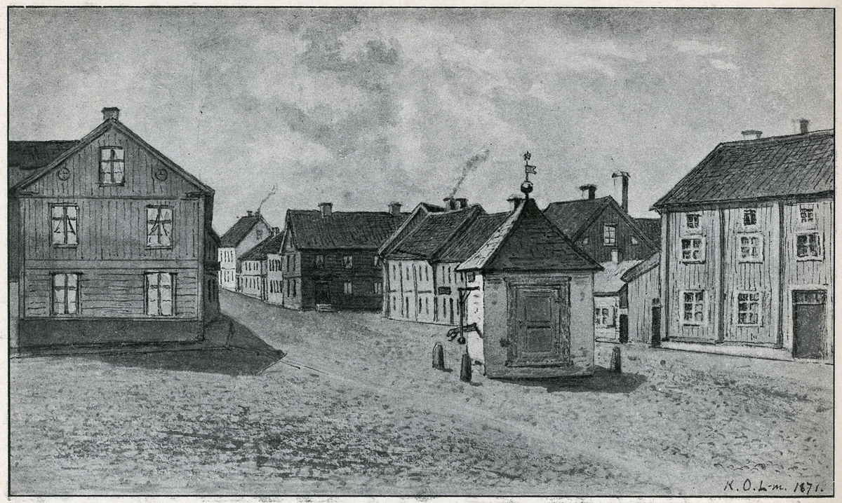 Örebro. Näbbtorget och en del av Våghustorget söderut från Drottninggatan, med gamla pumpkällan i förgrunden.