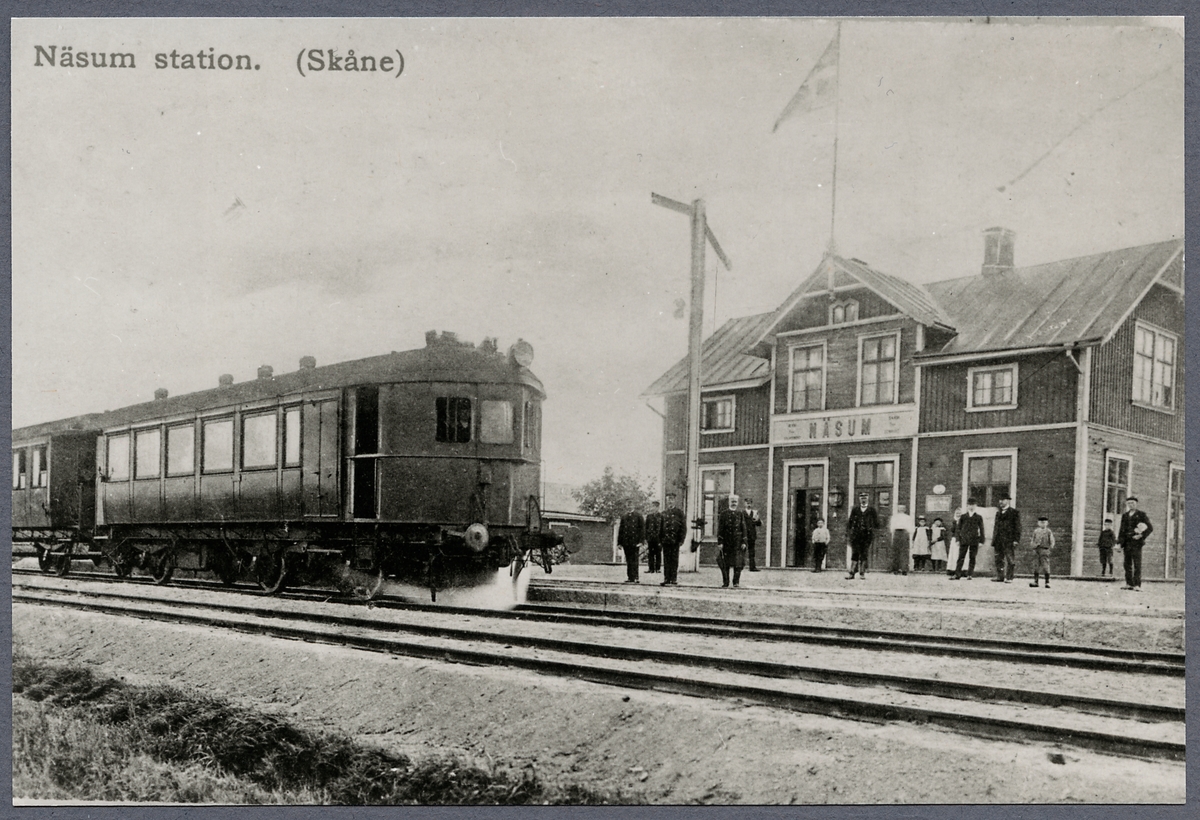 Ångvagn med tåg, Ångvagnen byggdes av Waggonfabriken i Arlöv 1907 enligt franska Purreysystemet. På grund av skötselsvårigheter använd som vanlig vagn efter några år. Slopad 1940 och ersattes med rälsbuss. (textinformation från vykort)