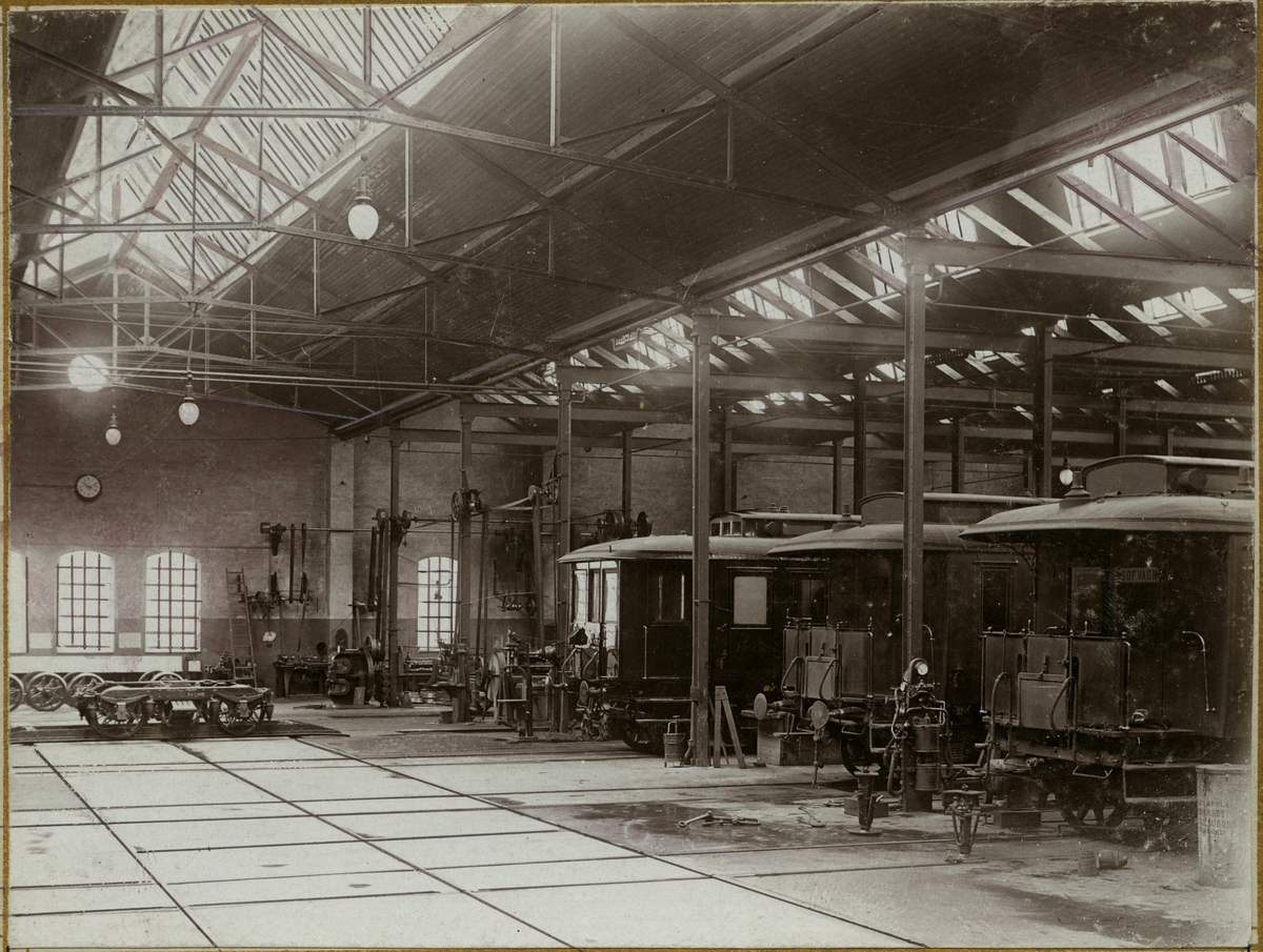 Tomteboda. Statens Järnvägar, SJ. Huvudverkstaden. Interiör av vagnverkstaden. Bortre vagnen är Statens Järnvägar, SJ C05 1393 som håller på att återställas till personvagn efter att ha varit ombyggd till elektriskt motorvagn i samband med försökselektrifieringen.