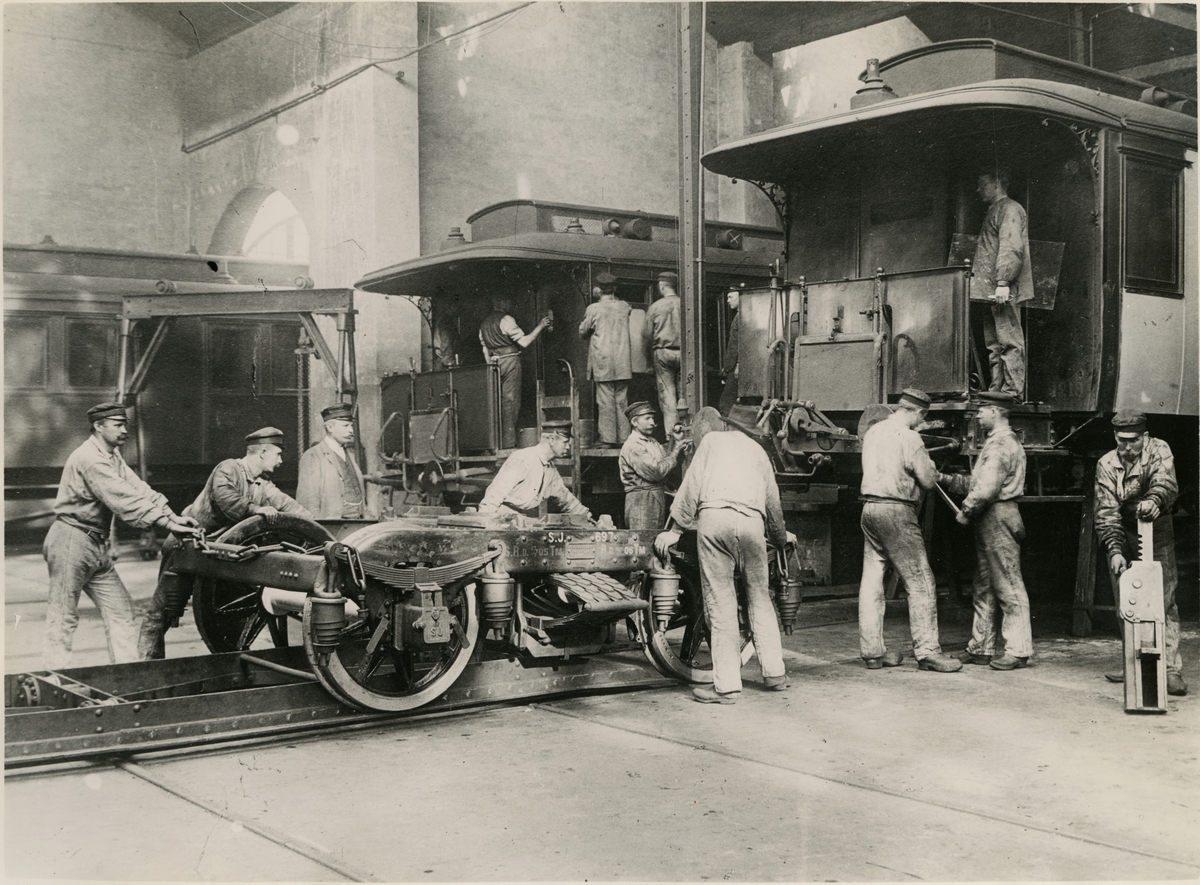 Tomteboda. Statens Järnvägar, SJ. Huvudverkstaden. Boggiebyte och lyftanordningar vid revision av vagnar. Med vagn Statens Järnvägar, SJ boggi 697 och SJ BCo 1210.