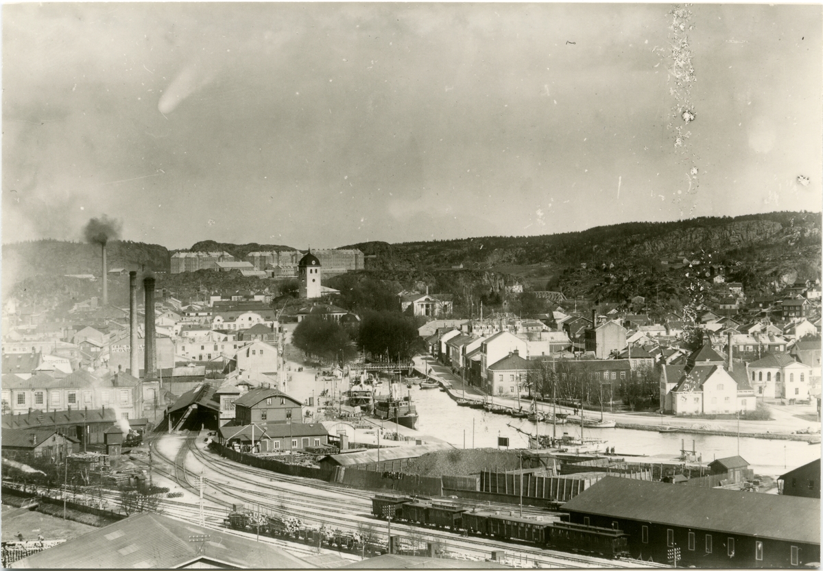Utsikt över Uddevalla - Vänersborg - Herrljunga Järnvägs, UWHJ, och Uddevalla - Lelångebanans, ULB, station och bangård i Uddevalla.