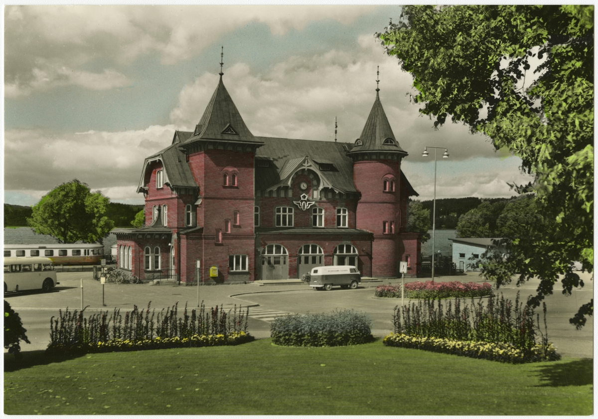Järnvägsstationen i Ulricehamn, sedd från gatusidan. Till vänster syns en SJ-buss. På spåret står ett motorvagnståg. Kolorerat vykort.