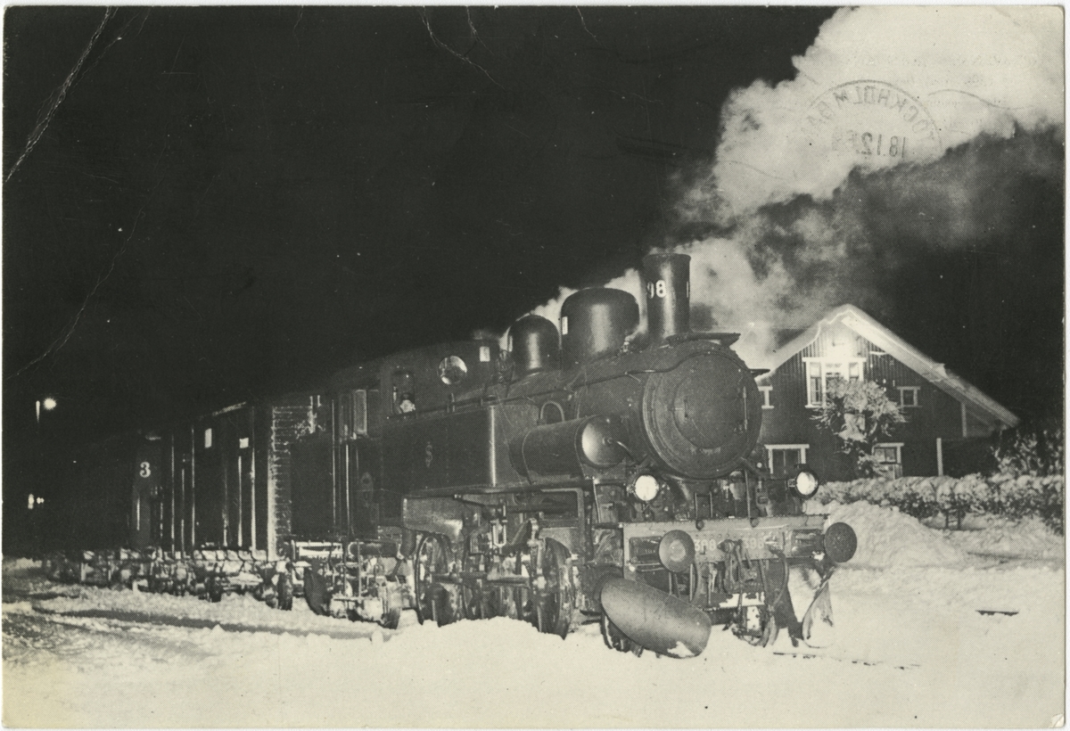 Statens Järnvägar, SJ J 1398 med persontåg vid Tärnsjö station. Ångloket tillverkades 1918 vid Motala Verkstad.