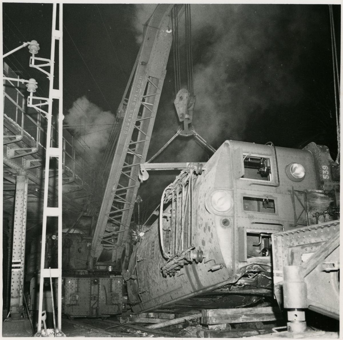 Statens Järnvägar, SJ Dk 539. Ångkran "Nässjö". Urspårning av lok och kranarbete vid Tomteboda.