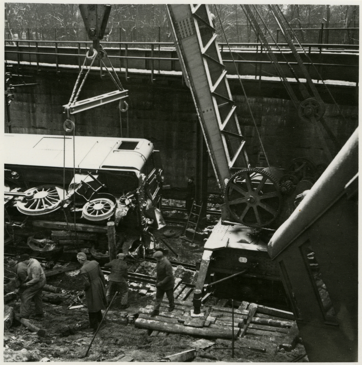 Urspårning av lok och kranarbete med ångkran vid Tomteboda.