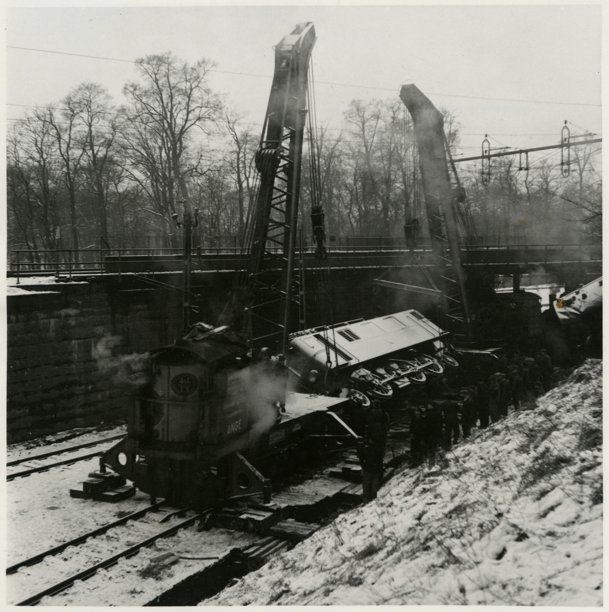 Urspårning av lok och kranarbete med ångkran "Ånge" och "Nässjö" vid Tomteboda.