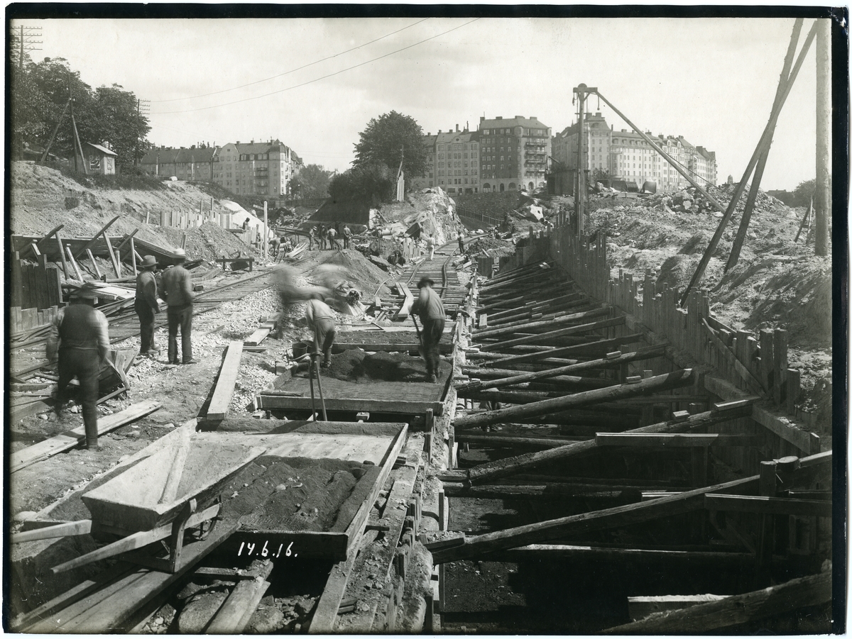 Byggarbete för viadukt över spåret Tomteboda - Värtan och grundläggning för landfästena vid Tomteboda.