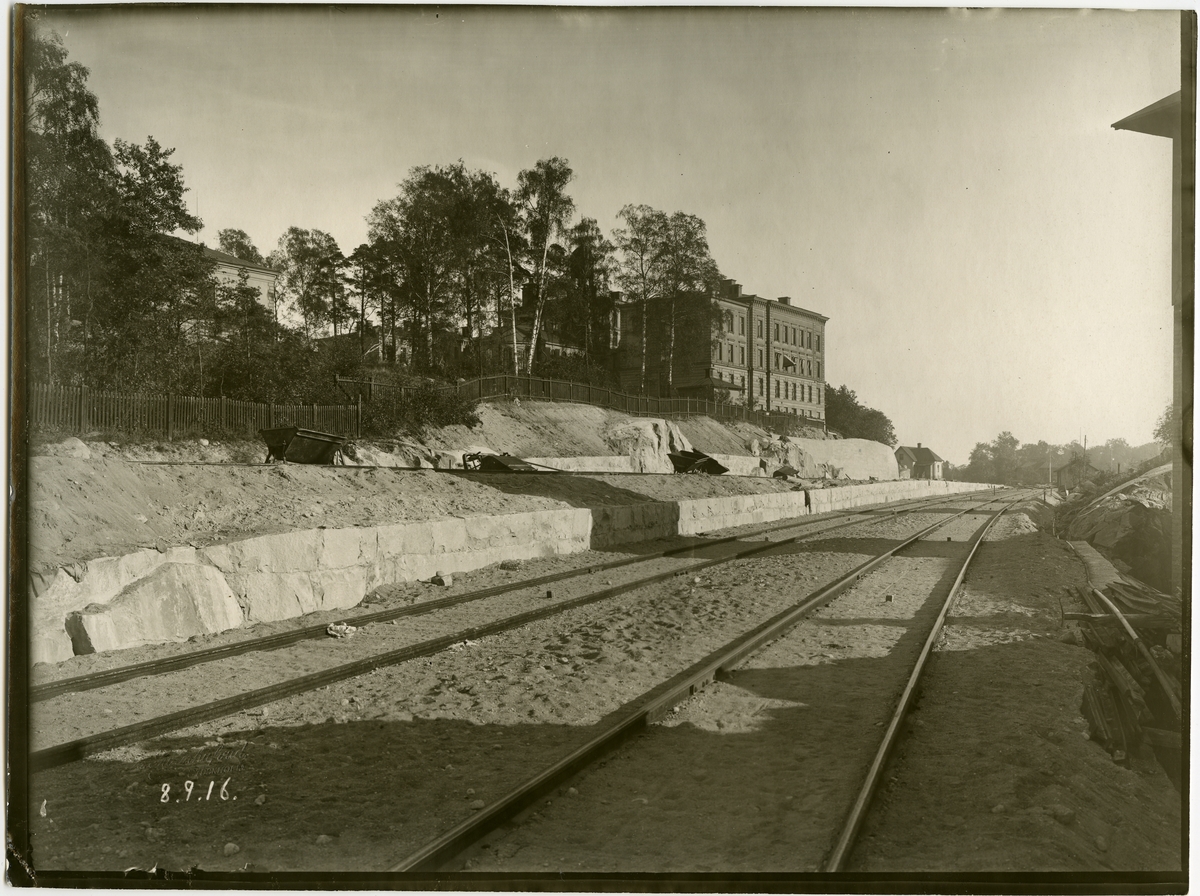 Stödmur mellan Stockholm Västerås Bergslagen, SVB och SJ spår vid blindinstitutet. Linjen Tomteboda - Hagalund.