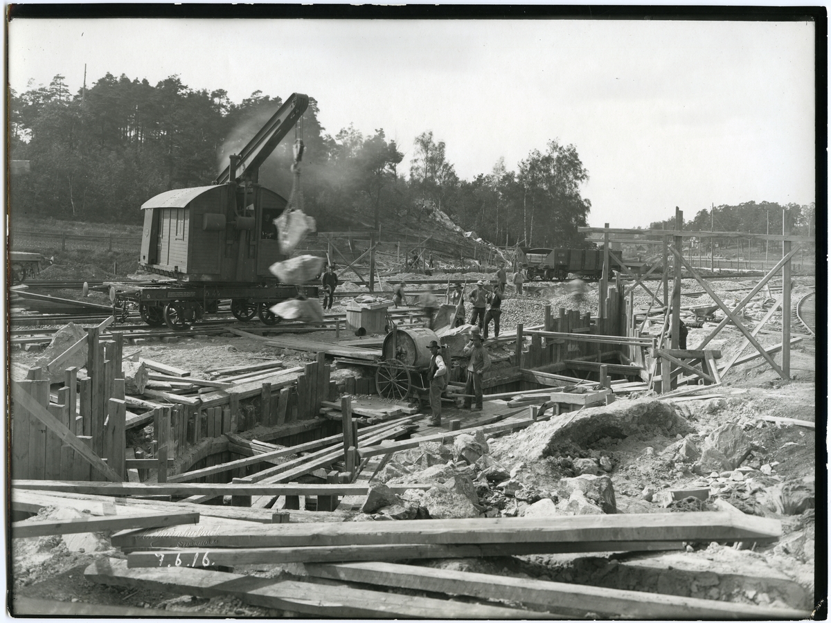 Stockholm Västerås Bergslagen, SWB viadukten gjutning på linjen Tomteboda - Hagalund. Ångkran SJ Q8 1074.