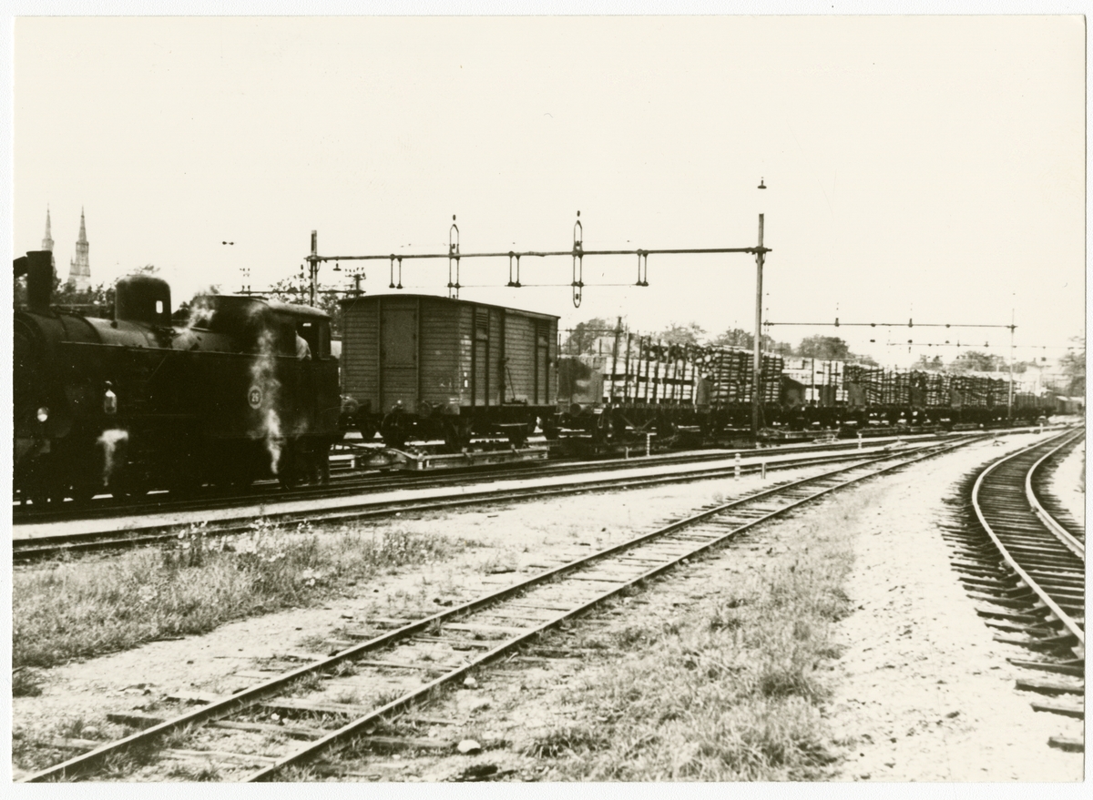 Vy vid bangården i Uppsala. Stockholm - Roslagen Järnväg, SRJ lok 26.