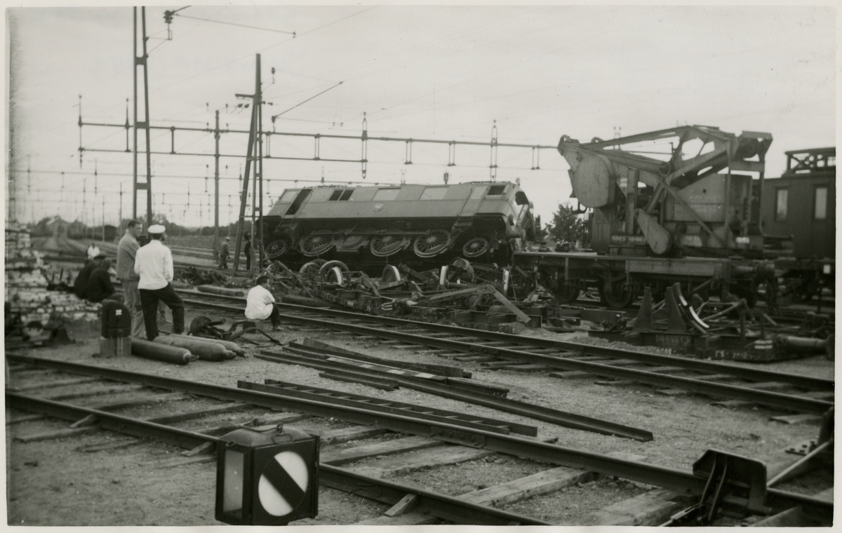 Godståg 4227 urspårar vid Uppsala central den 14/9 1939. Statens Järnvägar, SJ Dg 385.