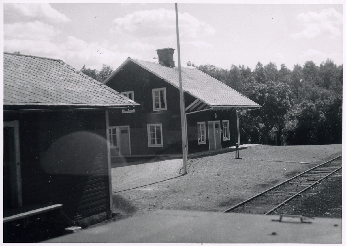 Vy vid Dala Finnhyttan. Spår fanns åt sydost 1,6 km i en vid båge åt ost-norr-nordost till Smältarmossens gruva och anrikningsverk, rivet före 1963.