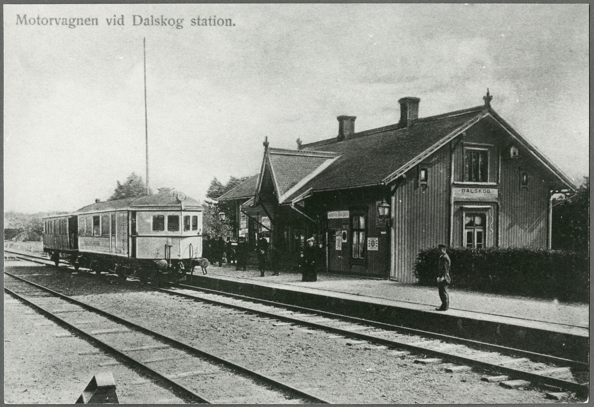 Vi vid Dalskog. Stationen fanns redan från 1879. En- och enhalvvånings stationshus i trä. Trafikplats anlagd 1879. Nuvarande stationshus i två våningar uppfört 1943.