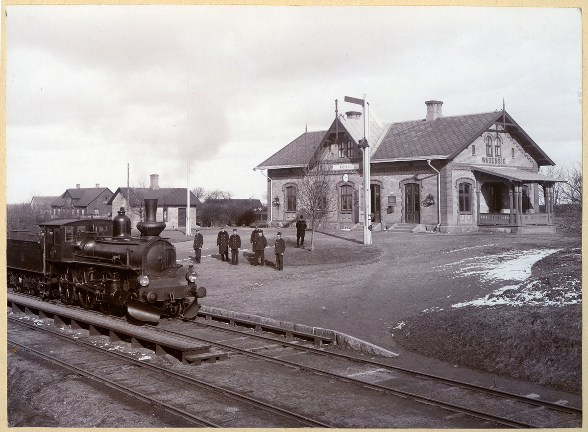 Statens Järnvägar, SJ Statens-Järnvägar, Lok VKBg 495 före detta SHJ Skåne-Hallands-järnväg Lok nr 11. tillverkat Nohab 1891. Personal från vänster : Stationsmästare P. Friberg, Lokförare NP.Olsson Eldare Sahlberg. Tågmästare Nilsson. Konduktör Carlberg.