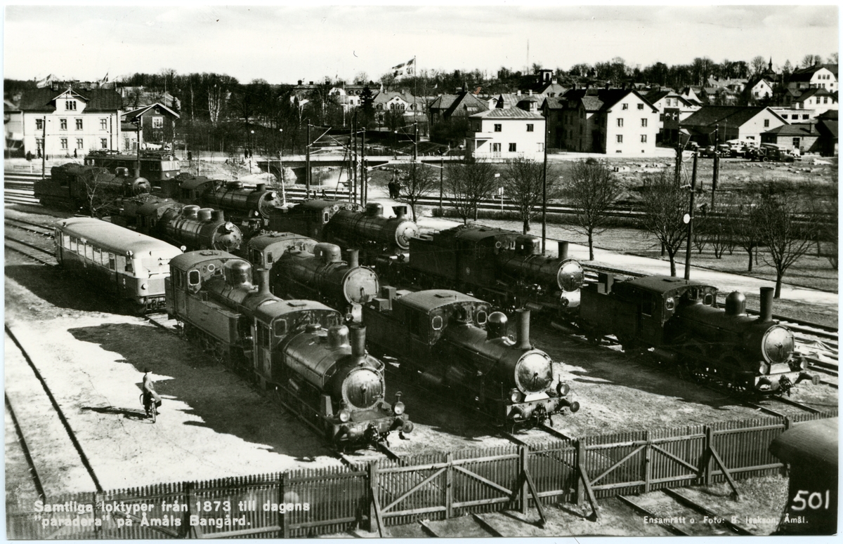 Bergslagernas Järnvägar BJ lokparad med bl .a. lok BJ 1, BJ 21 och BJ 29 och BJ 52.