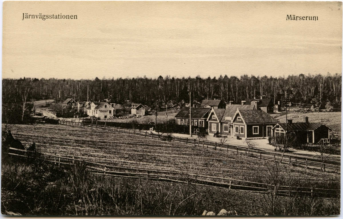 Vy över järnvägsstationen med omnejd. Trafikplats anlagd 1887. Envånings stationshus i trä, med två gavlar mot banan.