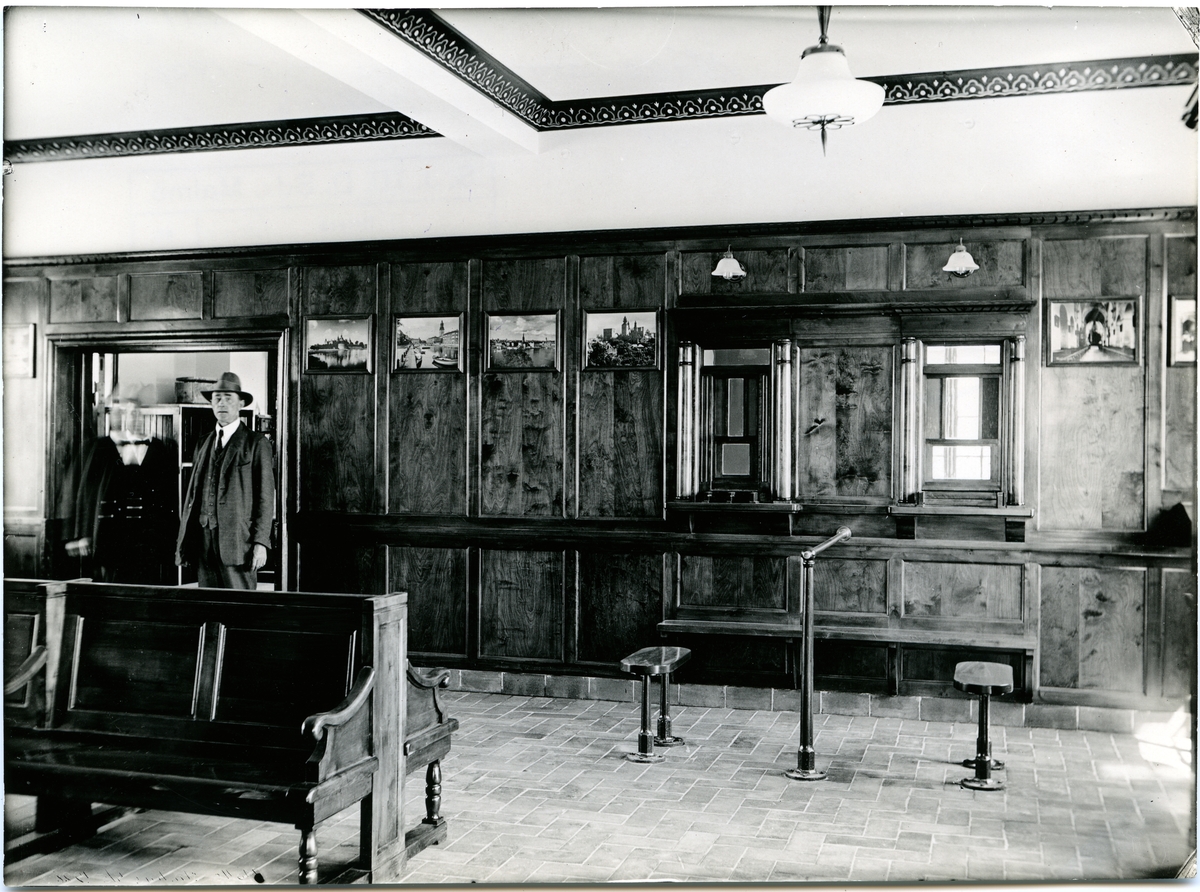 Interiör från stationshuset. Stationen byggd av Höganäs Mölle Järnväg, HMöJ, 1909. En- och en halv vånings stationshus i sten, på tvären över bangårdsänden. Större omändringar har vidtagits 1926-27.