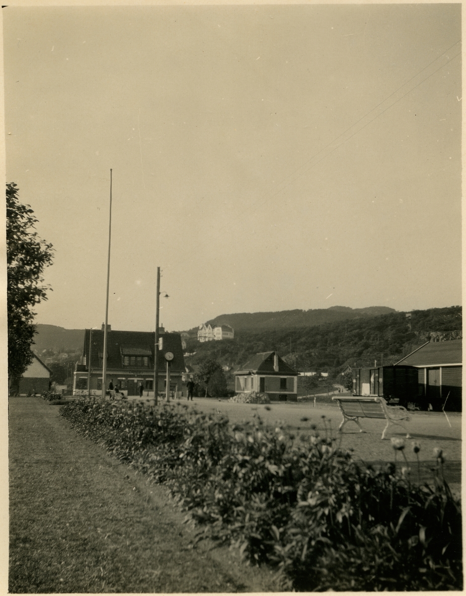Rabatt vid stationen. Fleråriga, perenna, blommor samt fläckar i olika färger af Darvintulpaner.