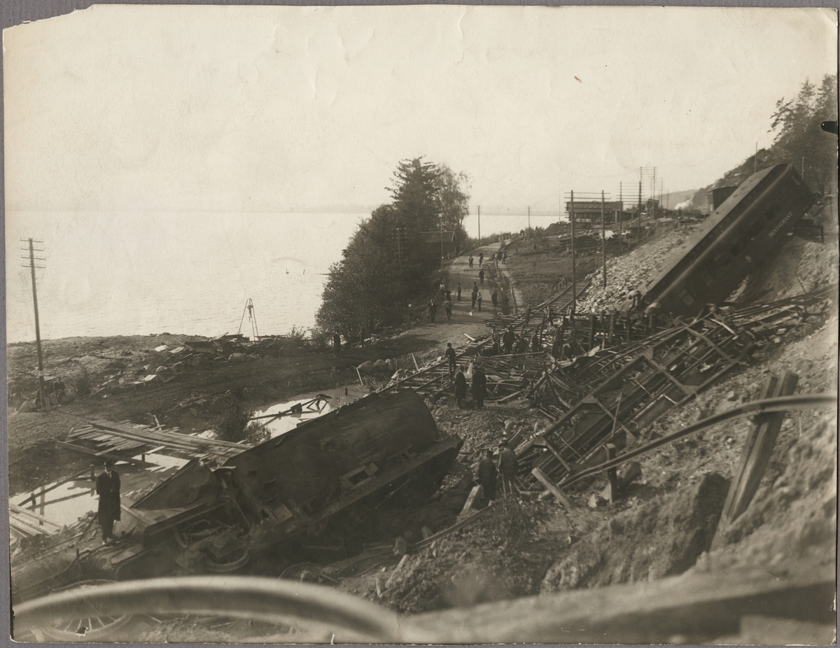 Tågolyckan vid Getå, 1 okotber 1918, där bland annat Statens Järnvägar, SJ F 1200 och ABo3 2466 har rasat nedför slänten.