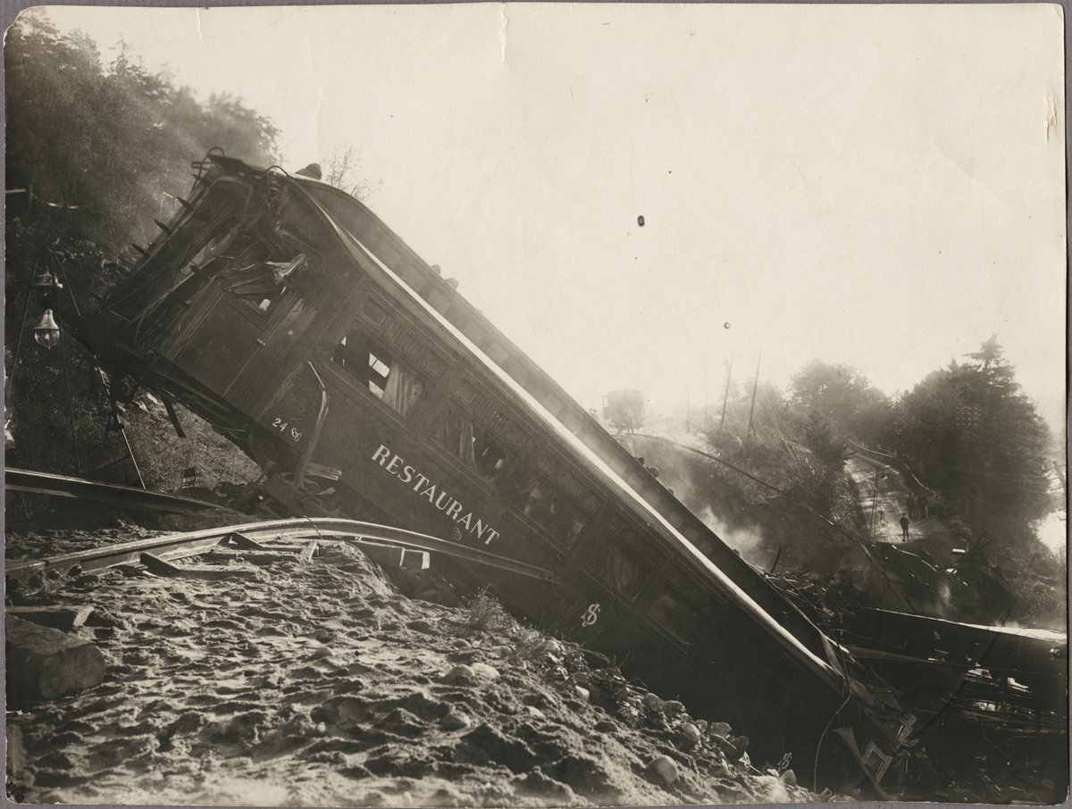 Statens Järnvägar, SJ ABo3 2466 på högkant efter raset i Getå den 1 okotber 1918.