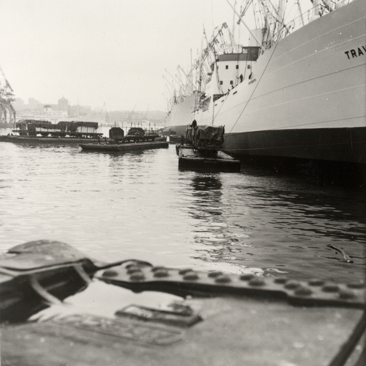 Göteborgs hamn. Pråmar försedda med räls användes för transport av smalspåriga godsvagnar till och från fartyg och industrier vid Göteborgs hamn.