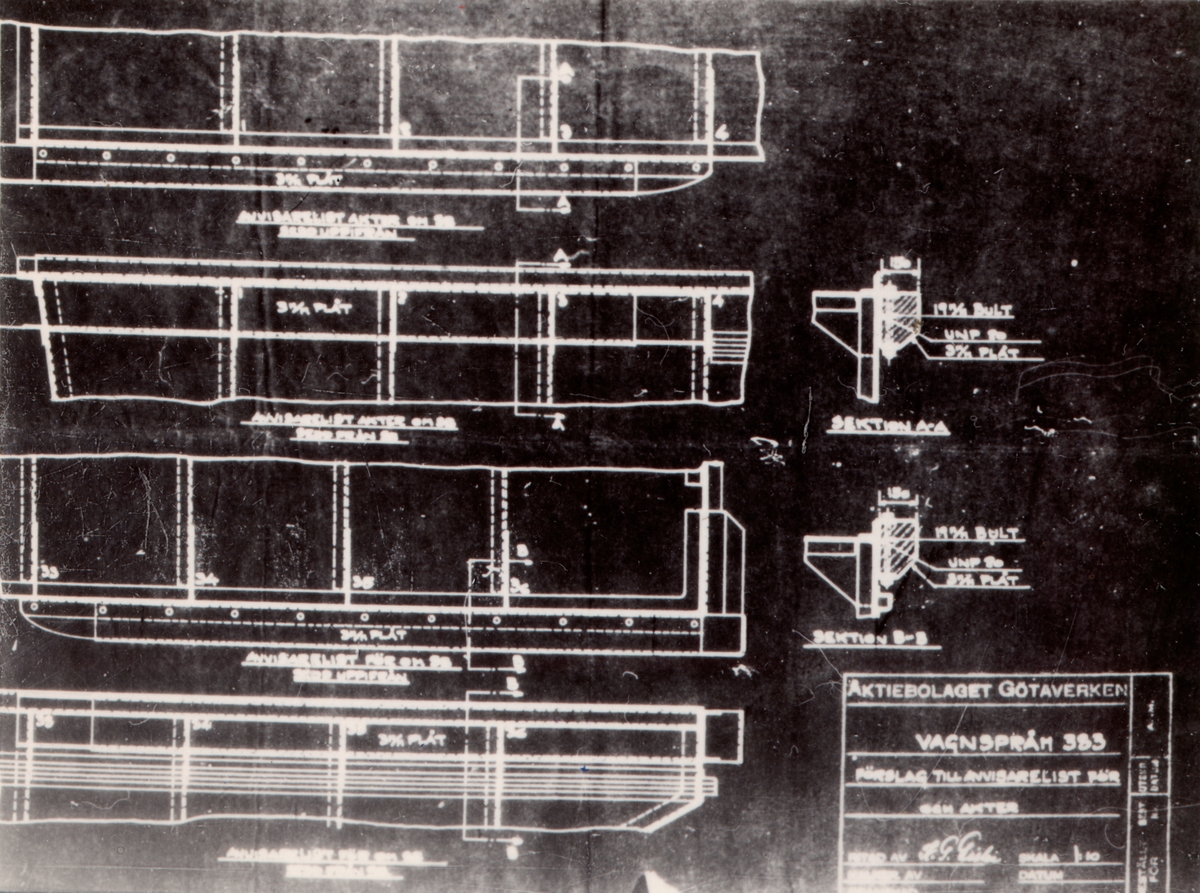 Titel: Vagnpråm 383. Ritning på förslag till avvisarelist för och akter.