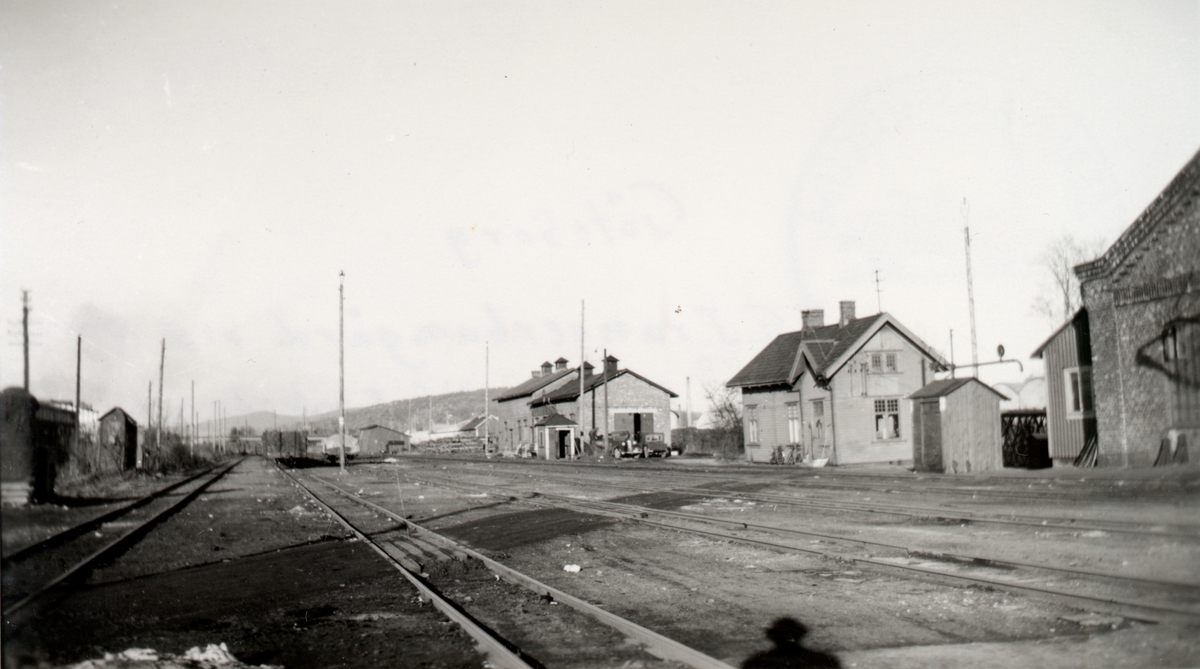 Göteborg. Västergötland-Göteborgs Järnvägar, VGJ, rangerbangård vid Marieholm, bortom VGJ lokstallar och verkstäder.