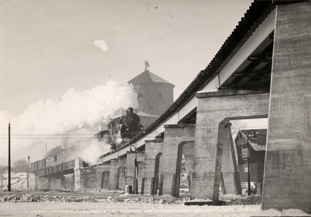 Viadukten för Västkustbane- och Boråsjärnvägarna med Skansen Lejonet i bakgrunden. Persontåg draget av ett Statens Järnvägar, SJ B.