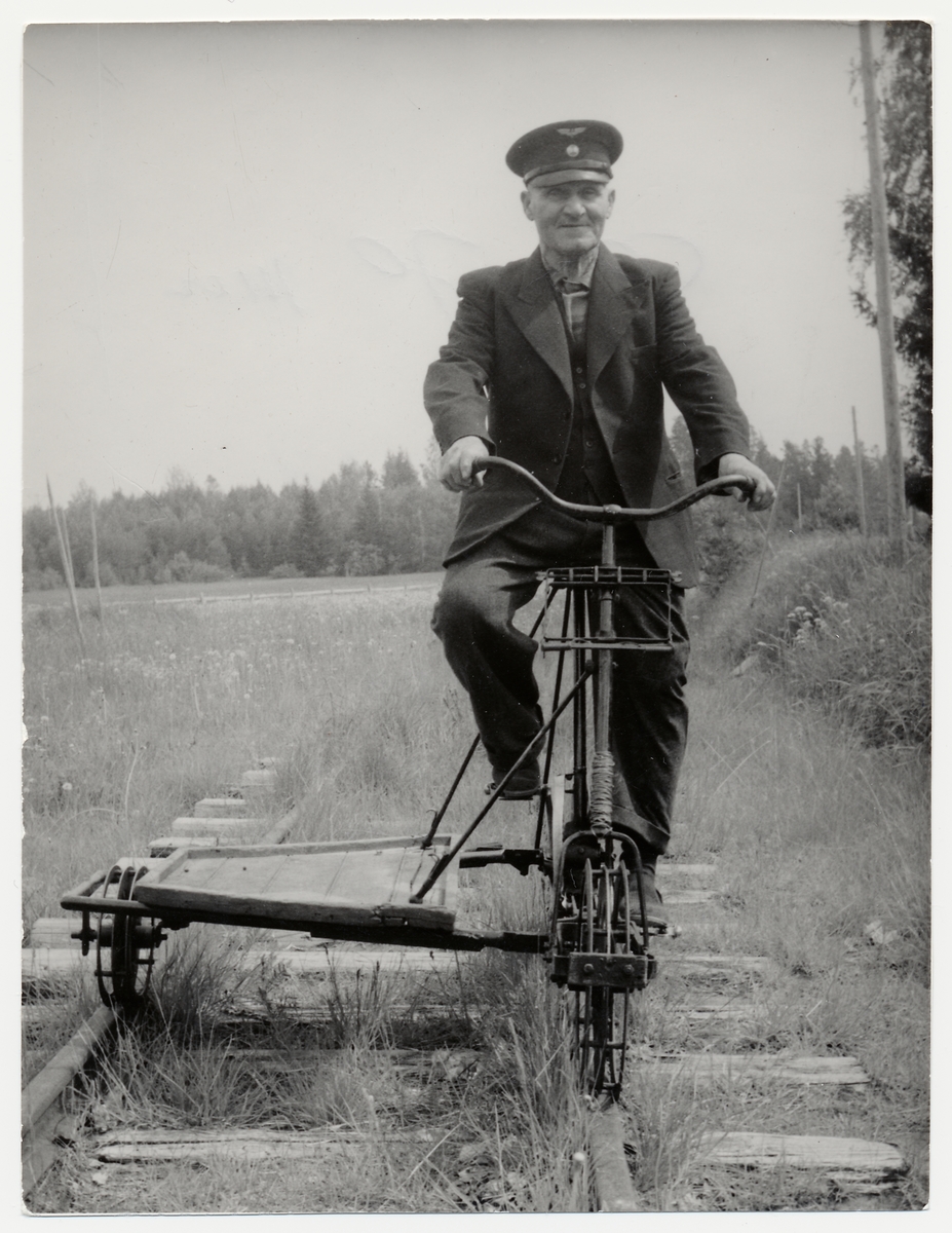 Förste banbiträde Sigfrid Andersson Risinge, Gimo 1959 med dressin på bibanan Risinge- Norrvällen.