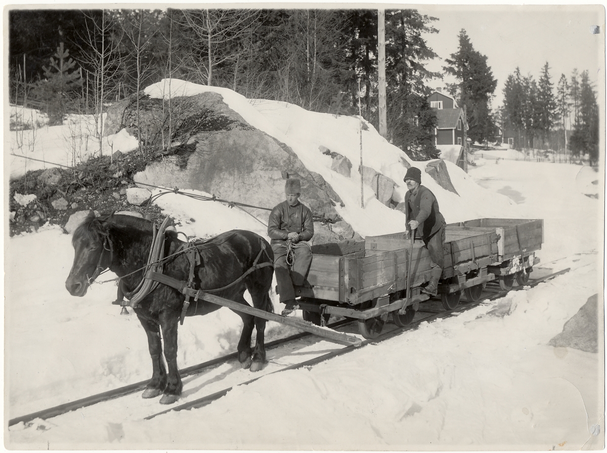 Häst som drar rallvagnar som användes på hästbanan Grängesberg - sjön Södra Hörken.