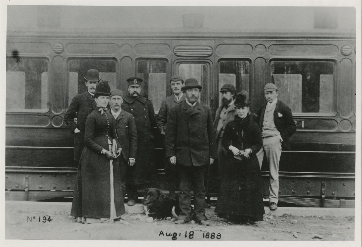 Tjänstemän med flera från " engelmännens tid vid Sandträsk station 1888 08 18. Från vänster Mr Millet Överingenjör, samt Mrs Millet, och Bergman bergsingenjör, Mellander jägmästare, Mr Milllet J:R, C. O. Bergman överste, Mrs Stuart ingenjör med fru, Mr Romanes ingenjör. Personvagn S.N.J. 1.