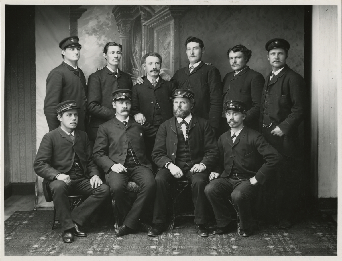Lokförare på Ofotenbanan, stående från vänster. Adolfasson, Högberg, Mr Ferguson, Magnusson, Ågren, Holmin. Sittande Mellander, Johansson ( körde bakre loket i första malmtåget) Skåneberg, Olsson.