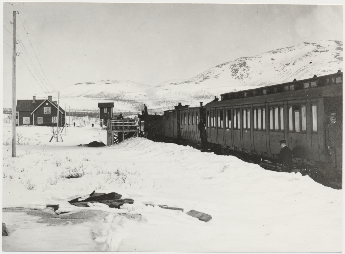 Vy vid Bergfors station med fjället Nakerivaara i bakrunden.