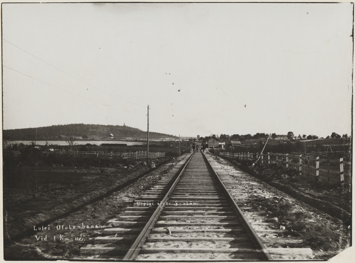 Vy över Svartön tagen 1 kilometer ifrån Luleås första stationshus som ligger till höger om banan i bildens mitt.
