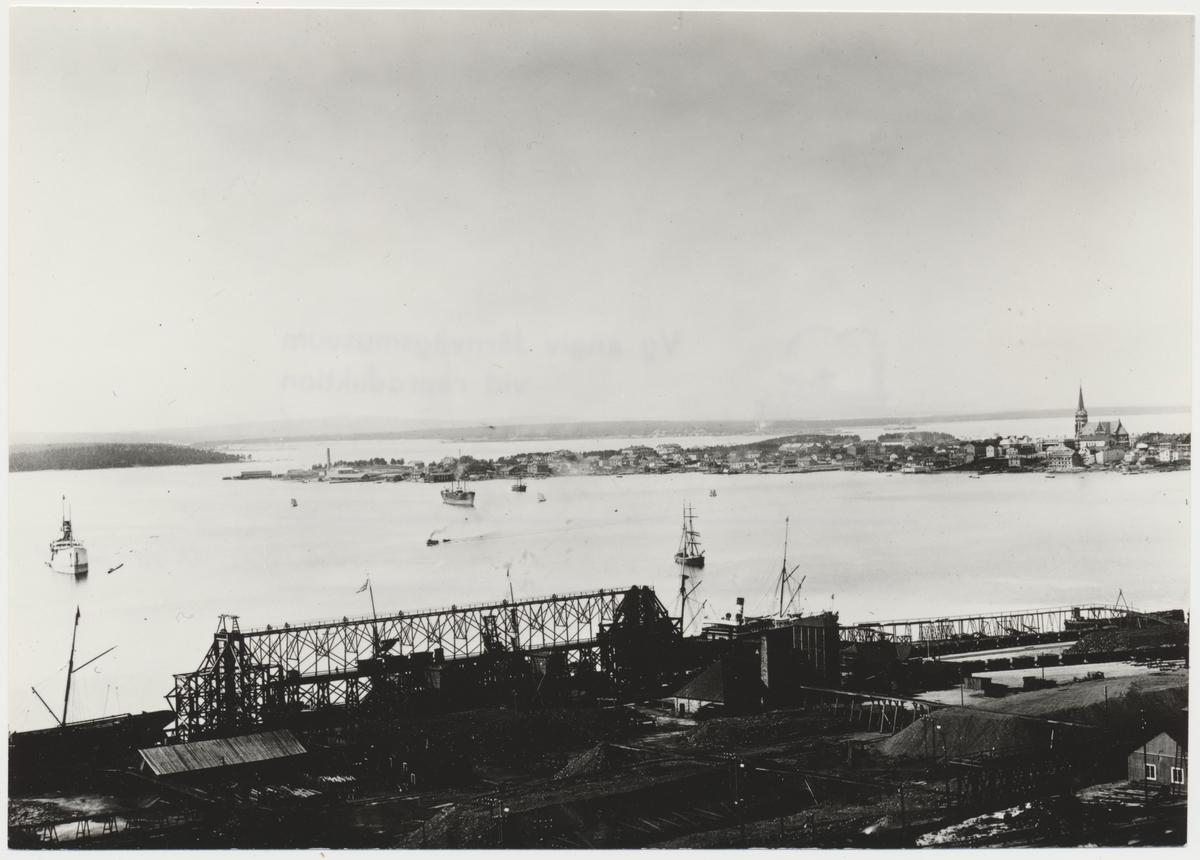 Vy av Svartön med elevatorn efter Gällivarebanans övertagande av staten. I bakgrunden på udden syns Luleå stad