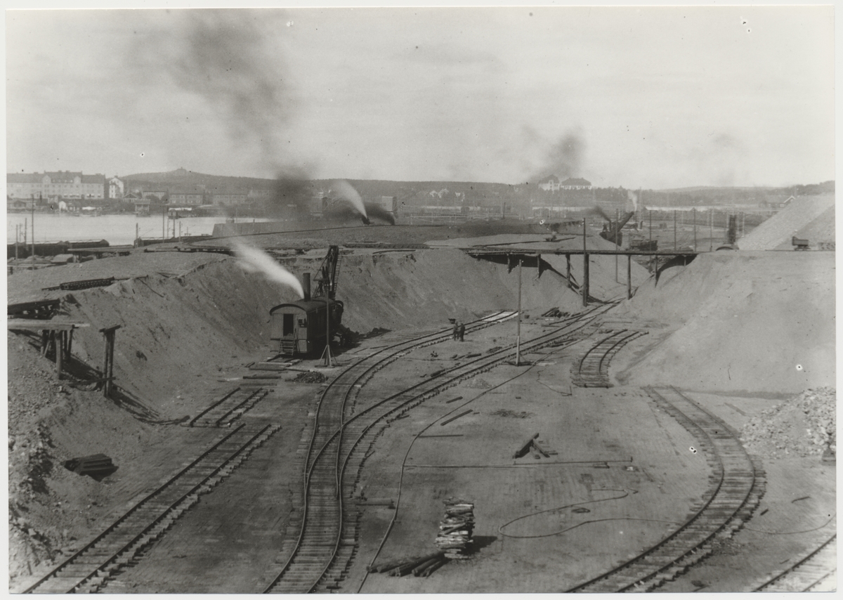 Ångmalmlastningskranar i arbete på malmupplaget på Svartön i Luleå