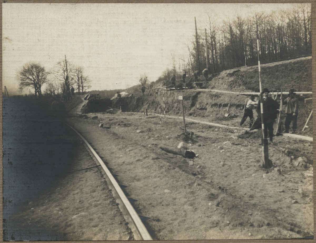 Dubbelspårsbanbyggnad Göteborg - Alingsås. Här genomschaktas gamla stambanan i Håvared, april 1916.