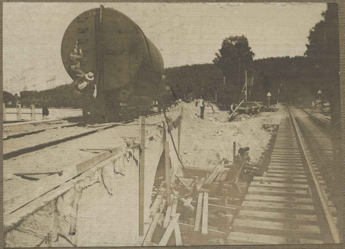 Dubbelspårsbanbyggnad Göteborg - Alingsås. Här provbelastas norra halvan av bron över Säveån. Norsesund år 1916.