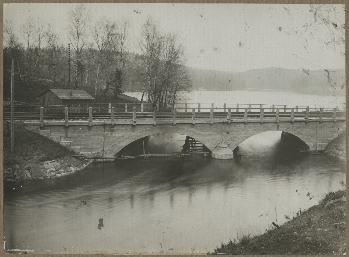 Dubbelspårsbanbyggnad Göteborg - Alingsås. Järnvägsbron över Säveån vid Norsesund. Nov 1916.
