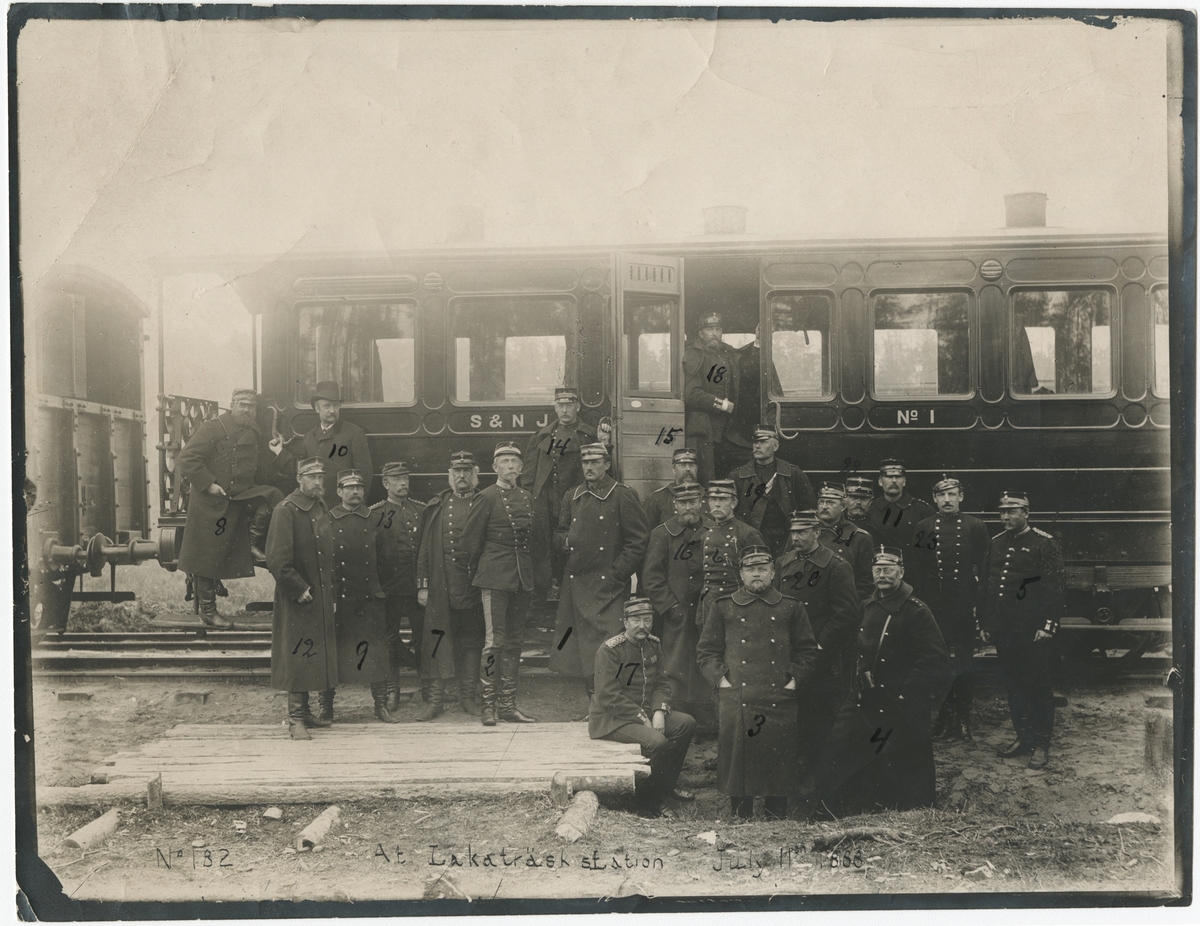 Generalstaben framför personvagn i Lakaträsk. Personvagn S&NJ 1.