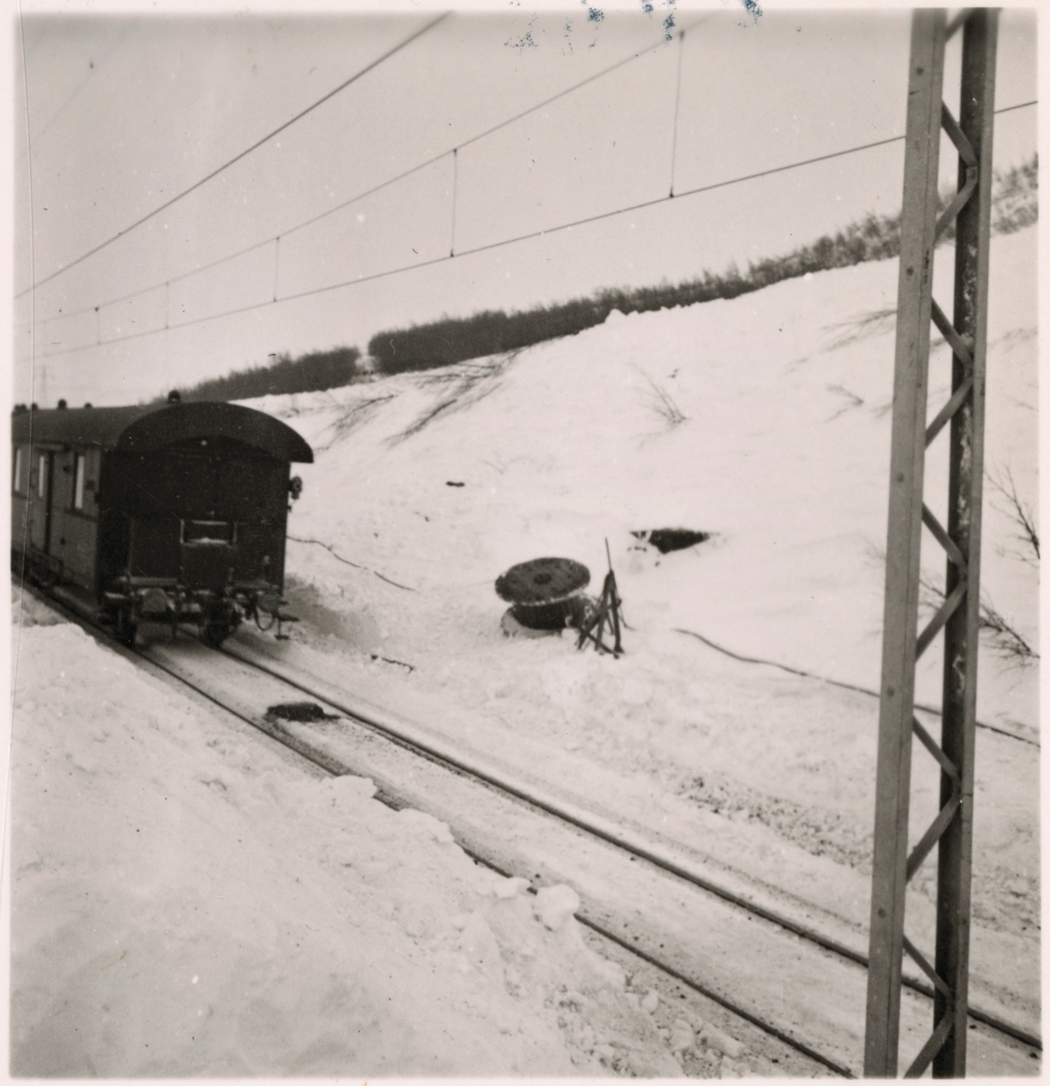 Reparation av kontaktledning på järnvägslinje efter snöskred.