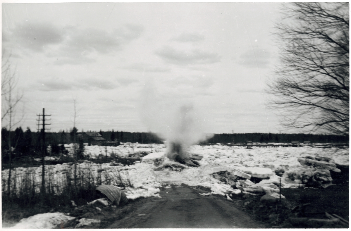 Vy på översvämmad väg vid Torneälven. Sprängning av is som blockerar vägen.