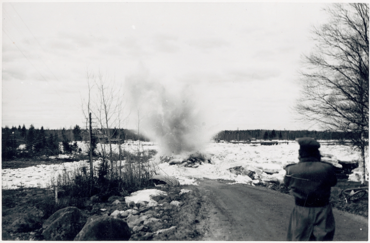 Vy på översvämmad väg och man vid Torneälv. Sprängning av is som blockerar vägen.