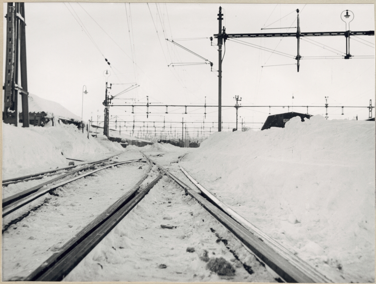 Bangård med vy på kontaktledningsbryggor under vintertid.