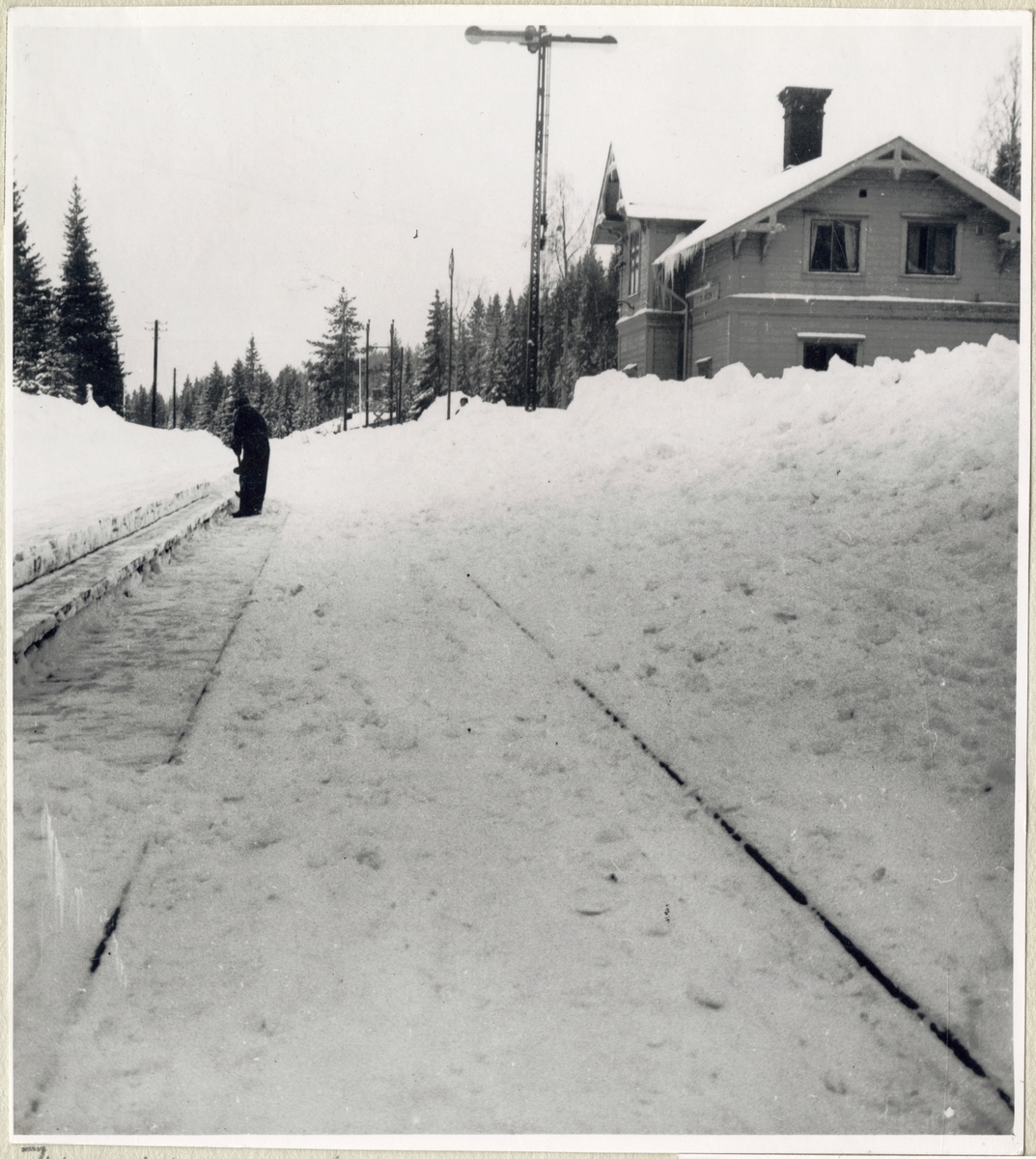 Stationsområde med vy på bangård och personal som utför snöröjning.