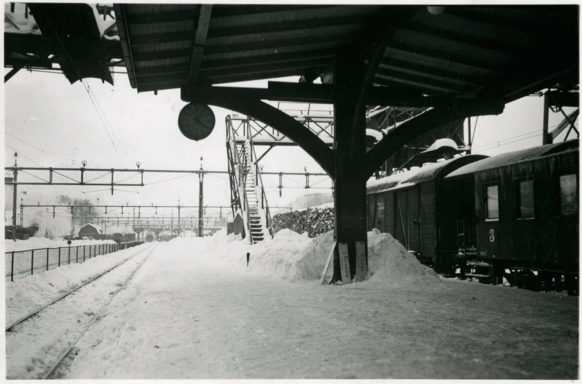 Plattform vid station med vagnar under vintertid med vy på bangård.